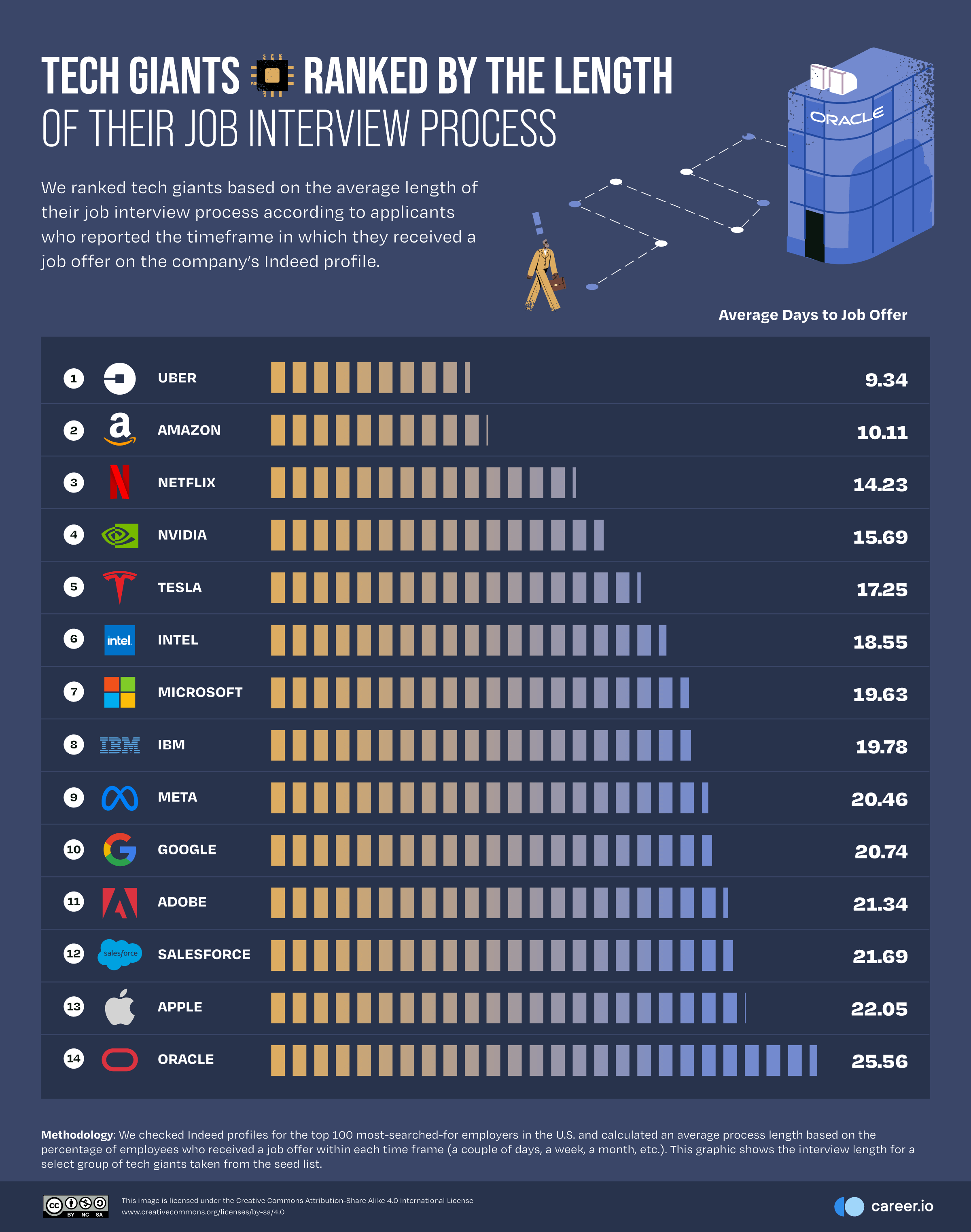 We found six tech companies where the interview process lasts around three weeks or more. Oracle, the world’s third-largest software company, has the lengthiest process, at 25.56 days. “The balance of power has shifted back to employers, which has resulted in hiring getting tougher,” says Laszlo Bock, former SVP of people operations at Google — where the average interview process now lasts 20.74 days. “After years of tech workers being pampered, of ‘bring your whole selves to work’ and ‘work from anywhere,’ executives are now overcompensating in the other direction.”