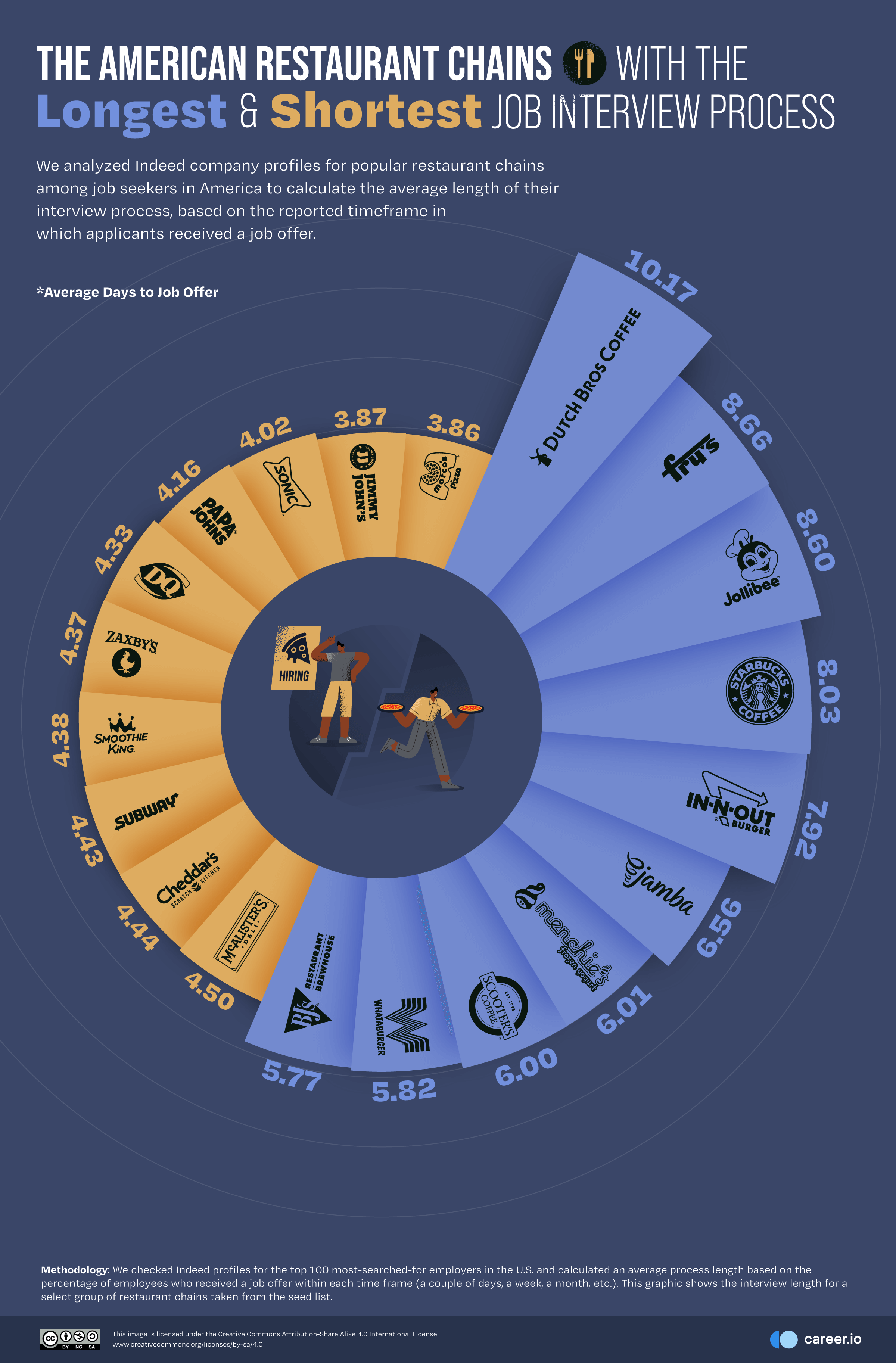 Marco's Pizza (3.86 days) leads the top ten restaurants for the shortest average turnaround times, all of which convert applicants to employees within five days — in other words, a working week. Papa John’s (4.16 days) and Subway (4.43) may be the highest-profile restaurants in the top ten. According to Glassdoor reviewers, a Papa John’s interview rates just 1.5 out of five in terms of difficulty. Papa John’s hurriedly employed 20,000 new staff at the start of the pandemic, bucking the trend for lay-offs along with other delivery services.