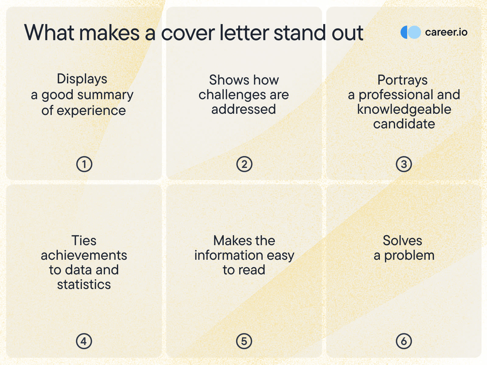 Displays a good summary of experience. First and foremost, a stand-out cover letter shows a potential employer that the candidate has the experience needed to be successful in the role. The summary of their skills and work experience should tie in with the job description.
