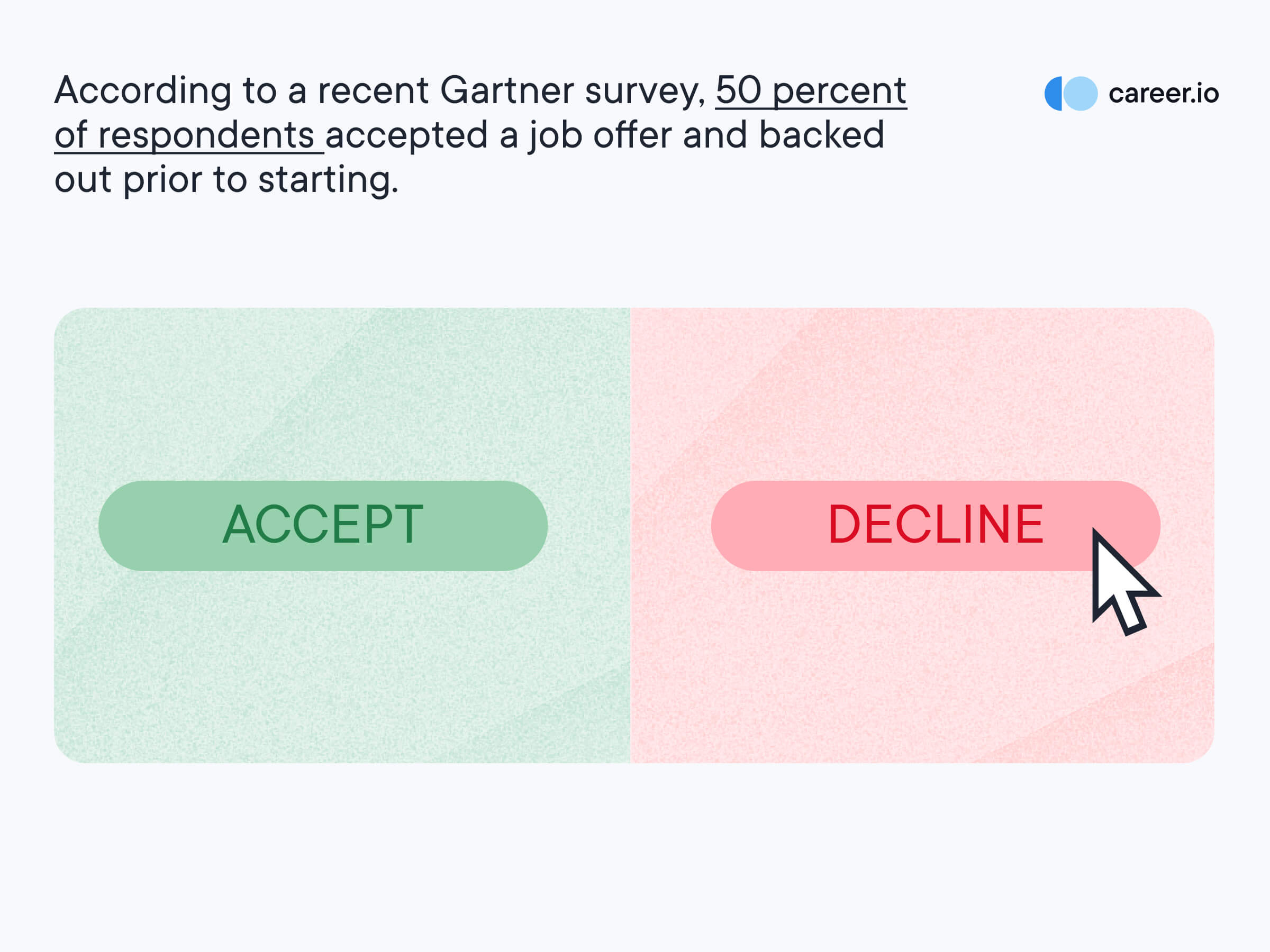 According to a recent Gartner survey, 50 percent of respondents accepted a job offer and backed out prior to starting (measured over a 12-month period). Interestingly, more than one-third (35 percent) received four or more offers during their last job search. The top drivers for accepting a job offer included: greater flexibility (59 percent), better work-life balance (45 percent), and higher compensation (40 percent).