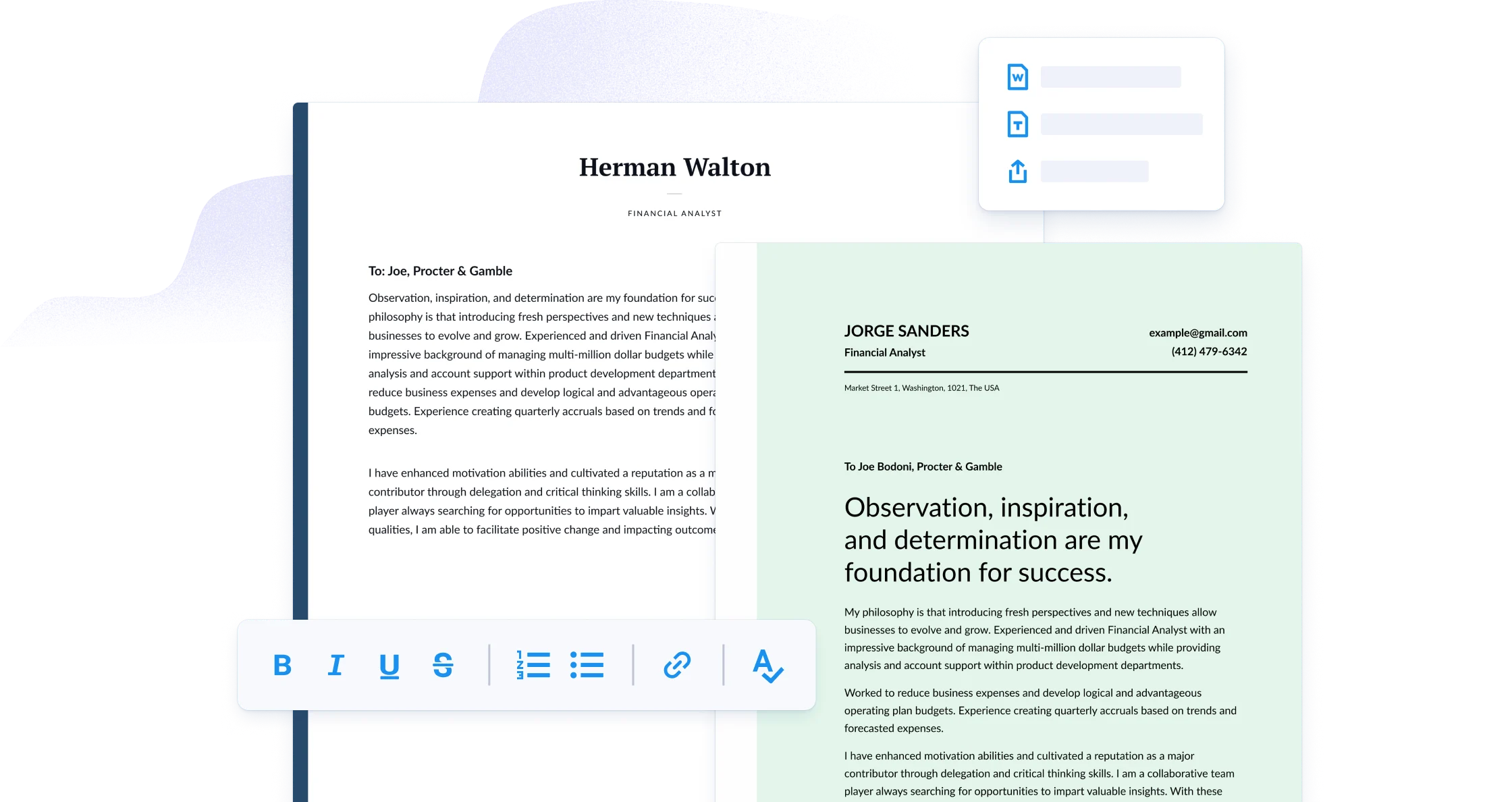 Build your cover letter with our recruiter-tested templates. Tailor the design, structure, and formatting in just a few clicks.