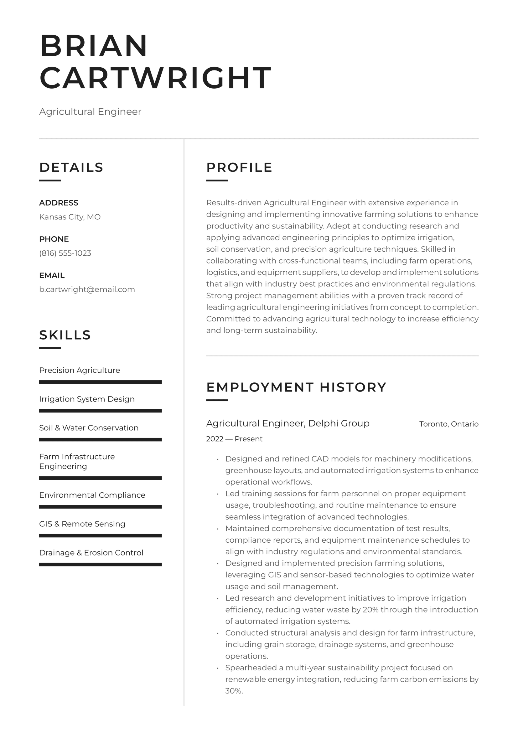 Your agricultural engineer resume should prove your record of solving problems and improving efficiency in farming or food production. It should describe the skills that you can bring to a new role, including problem solving, data analysis, and research.